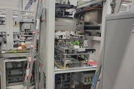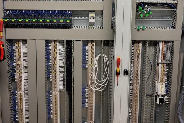 Práce na elektroinštalácií výrobnej linky v závode Jonas & Redmann. 2024, Berlín, Nemecko.