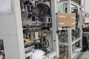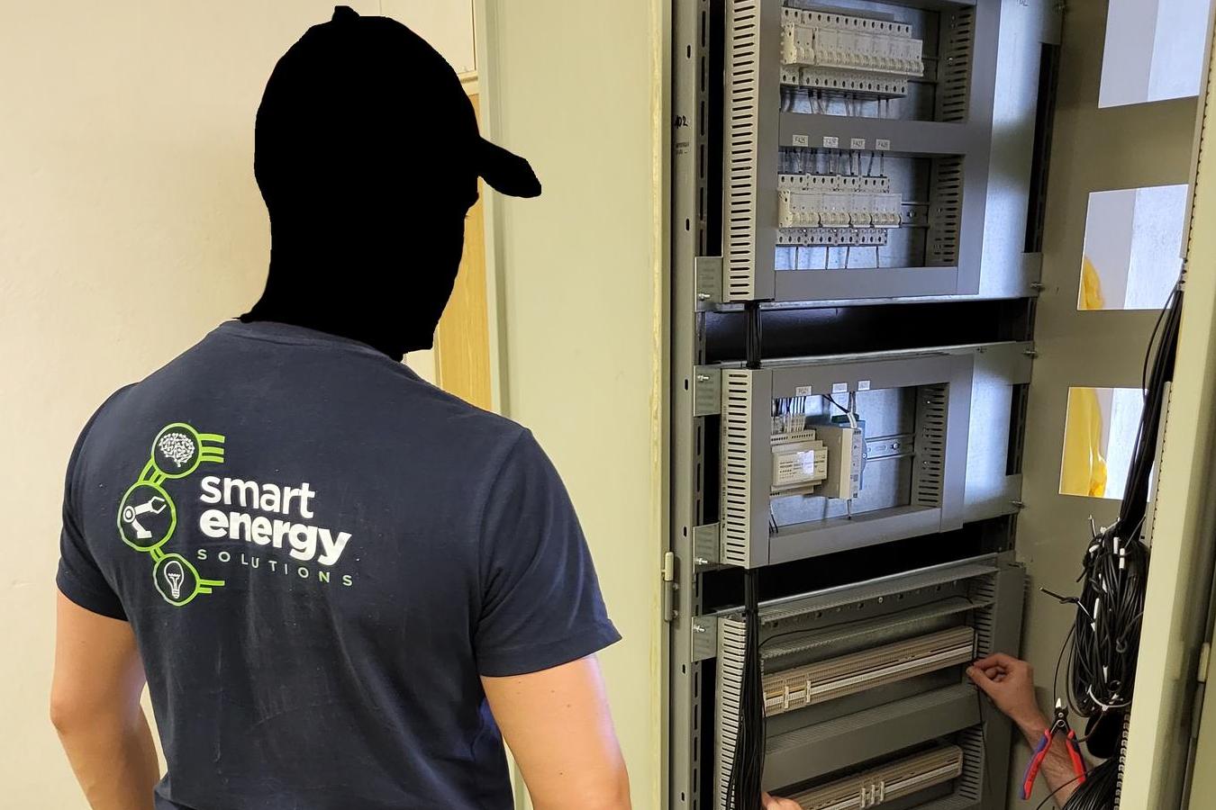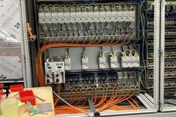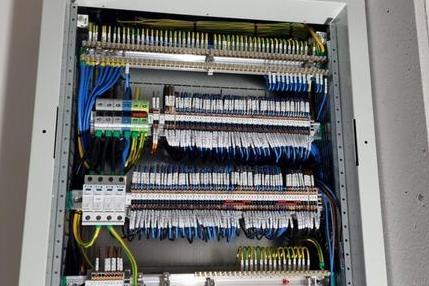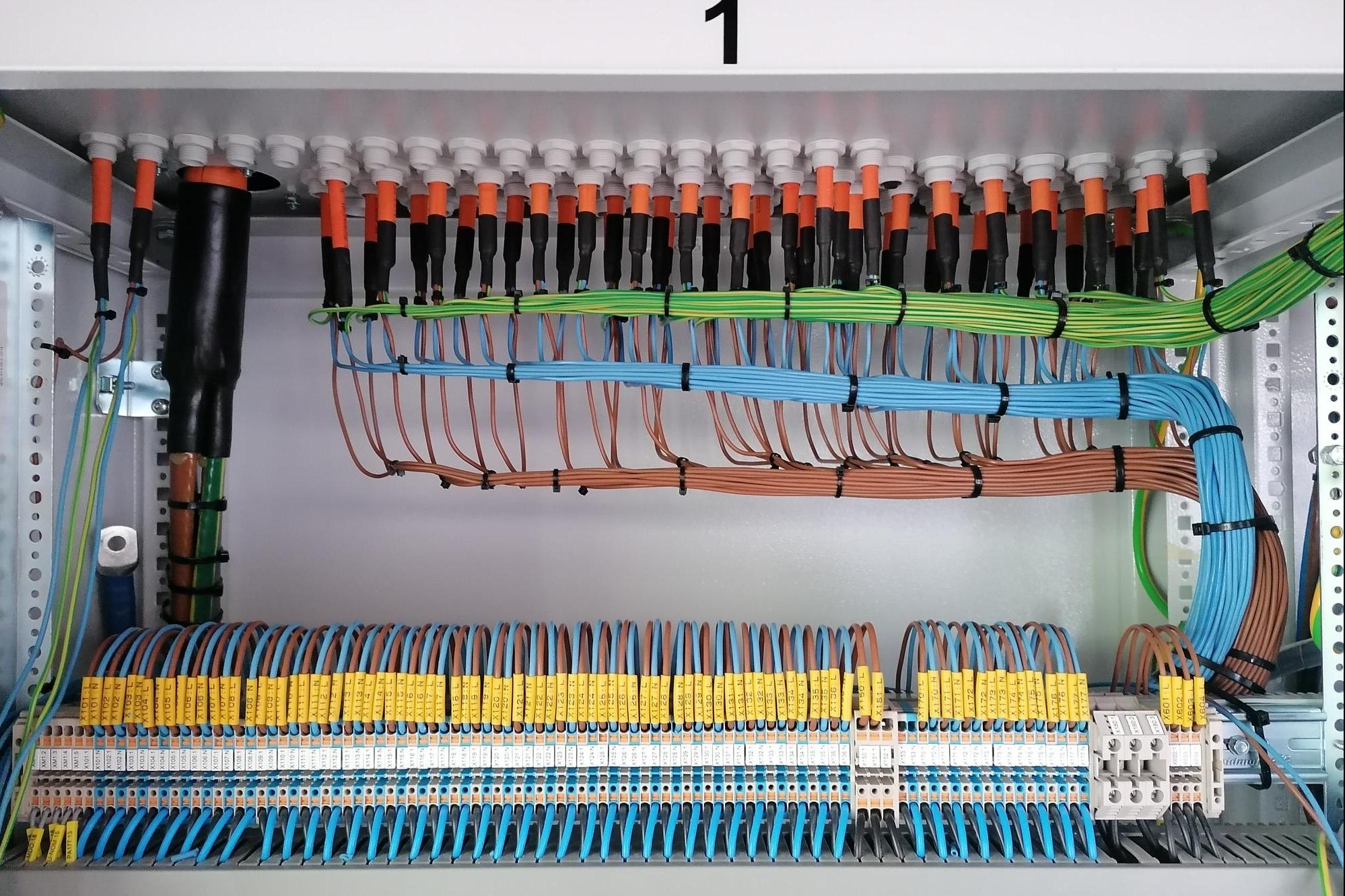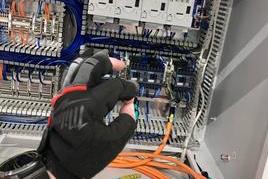 Práce na elektroinštalácií výrobnej linky v závode Jonas & Redmann. 2024, Berlín, Nemecko.